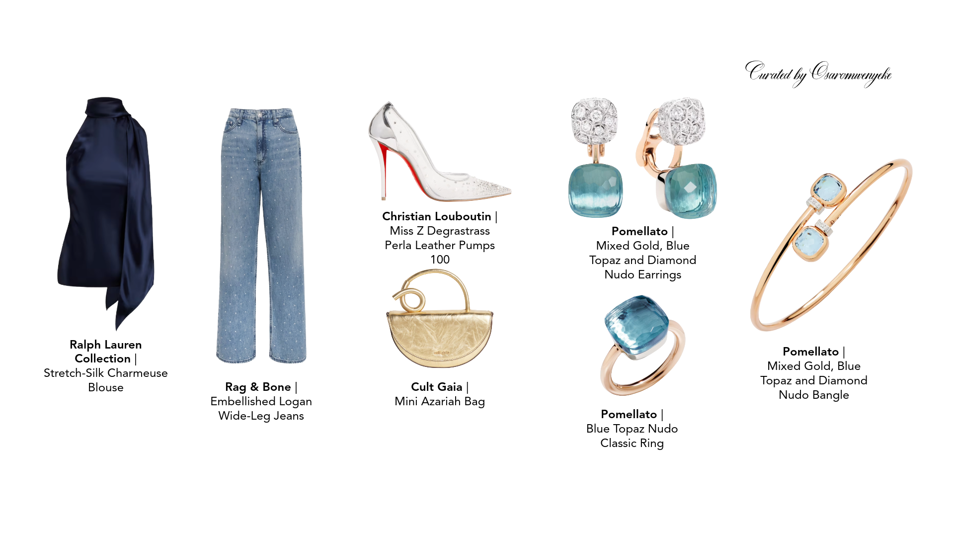 The jewelry elevates the look with quiet luxury. Blue topaz and mixed‑gold pieces add color with restraint, shine without excess, and sophistication without noise. Together, they reinforce the theme of cool-toned modernity softened by deliberate gold accents.