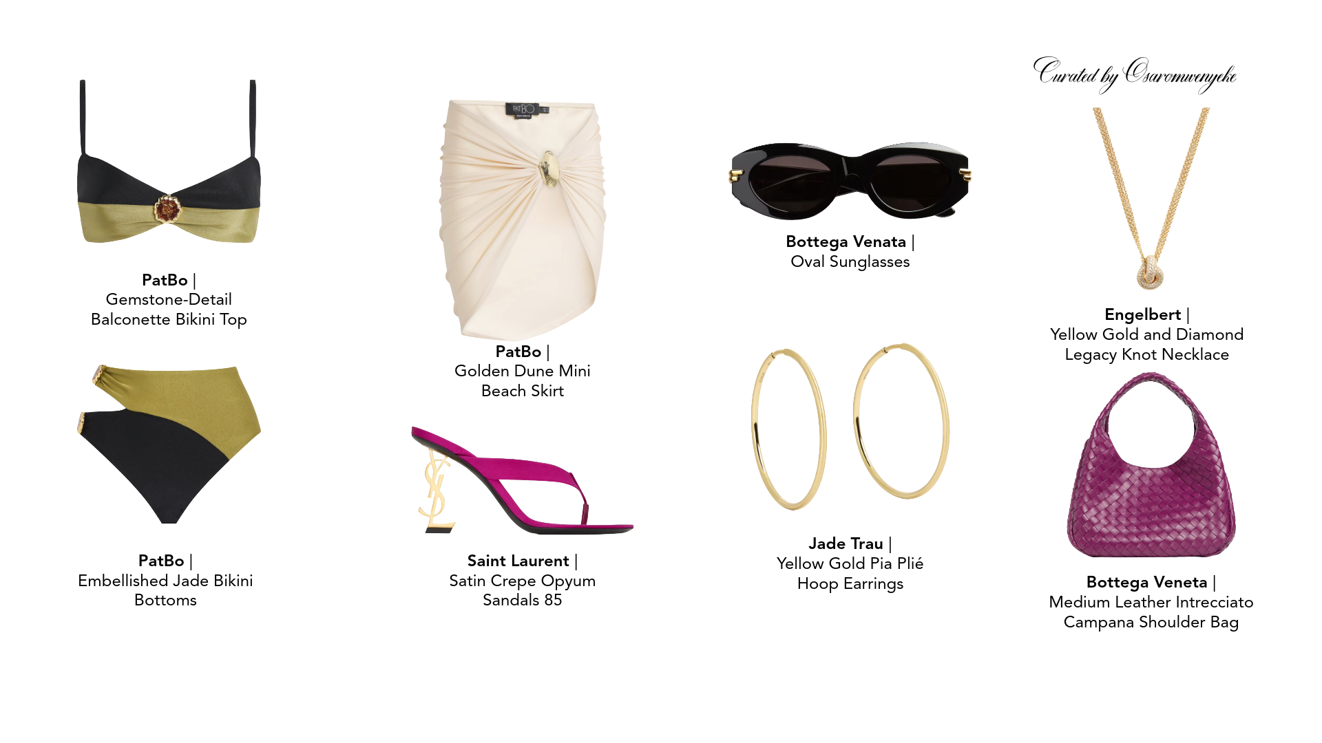 This look merges warm and cool neutrals through intentional contrasts in texture, color, and silhouette. The bikini establishes the foundation—sculpted, embellished, and visually dimensional. The mini beach skirt adds movement and soft coverage, creating a layered effect that feels polished rather than understated.