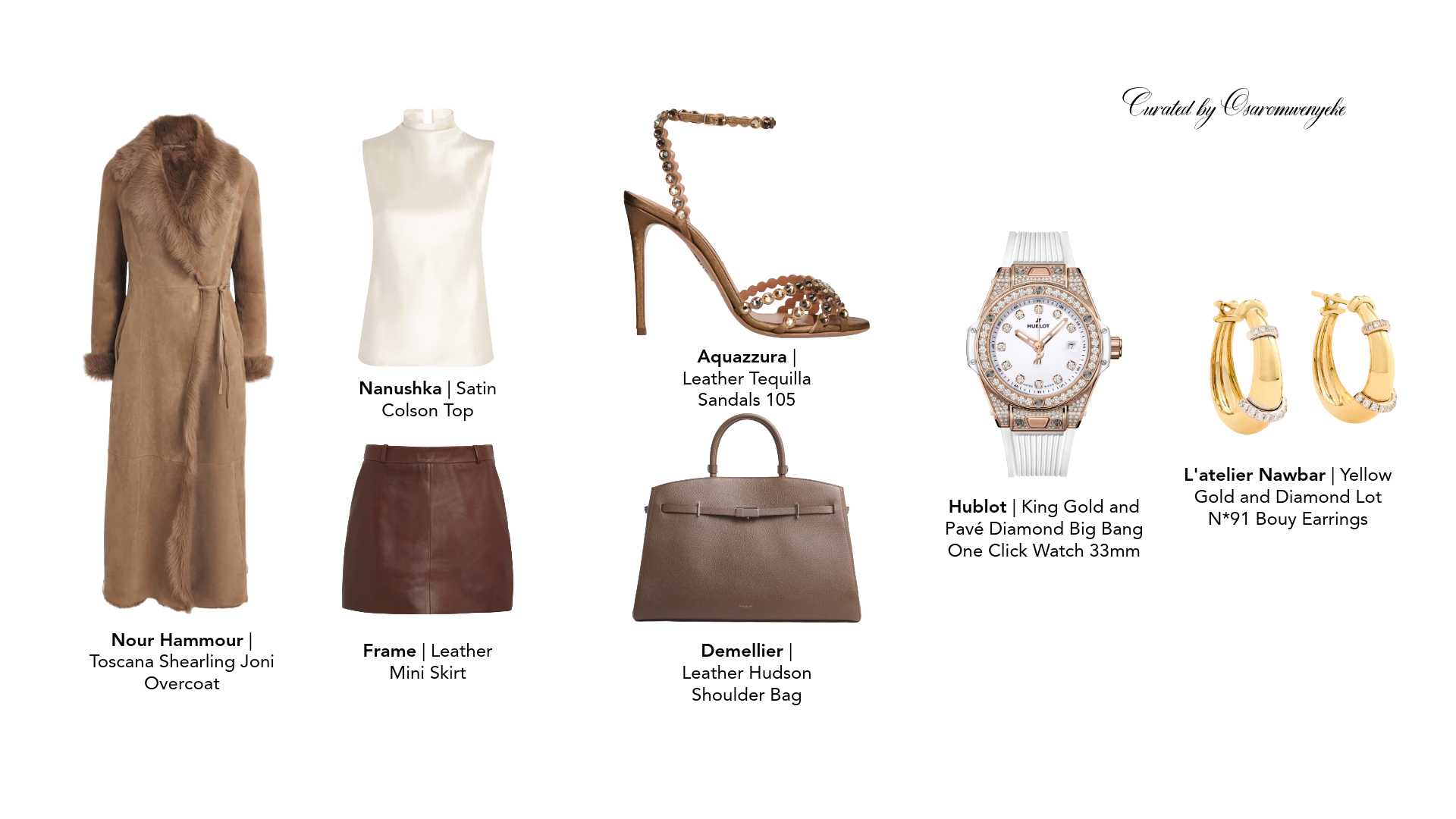 The accessories were chosen for an elevated presentation: gold, diamonds, and structured leather. Each piece reinforces longevity rather than trend. The watch and earrings introduce quiet opulence; the bag anchors the look with architectural clarity. The warm neutral palette unifies the composition, allowing texture—shearling, satin, leather, gold—to carry the visual interest without competing.